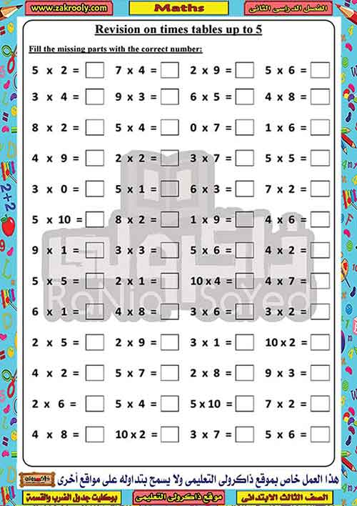 مذكرة تدريبات على جدول الضرب والقسمة من منهج الماث للصف الثالث الابتدائى